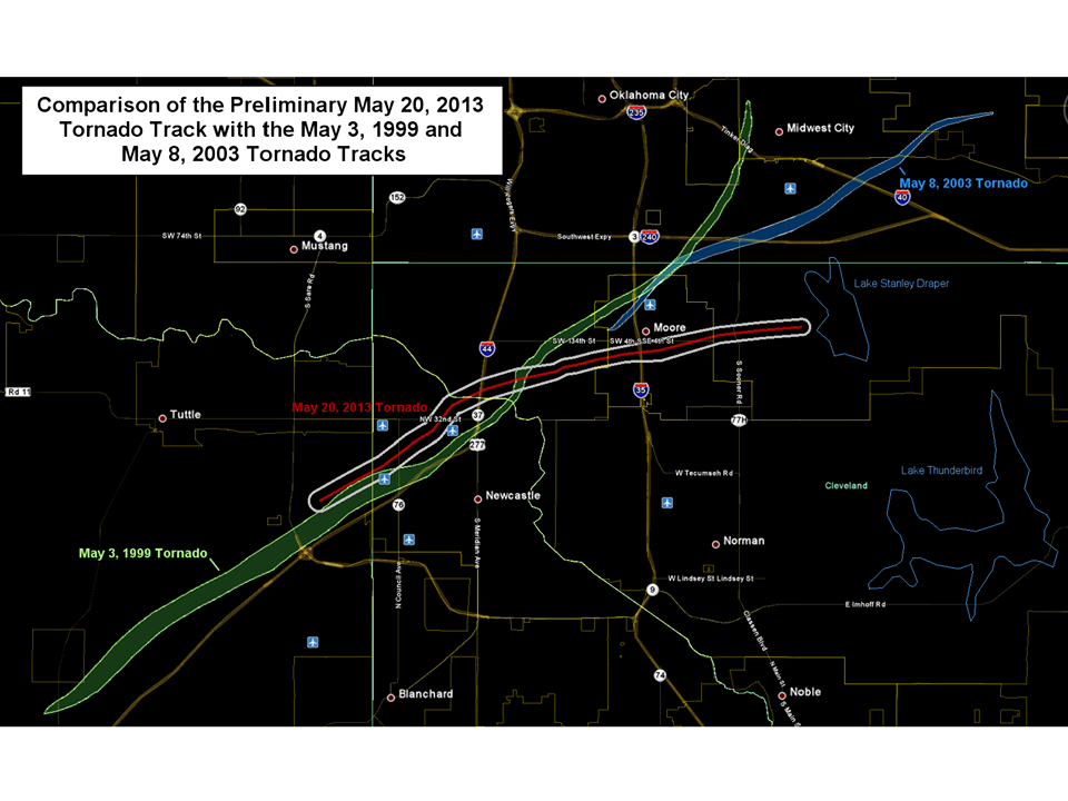 El tornado asesino tiene un camino similar con el monstruoso tornado que cruzo la ciudad de Oklahoma el 3 de mayo de 1999 y que mato docenas de personas..